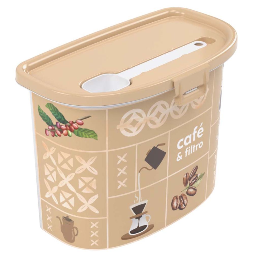 Pote de plástico para café com tampa fixa, colher dosadora removível e compartimento para o filtro de café. Capacidade para 1,5 litros. Mais praticidade para o seu dia a dia. Produzido em material atóxico, livre de BPA.